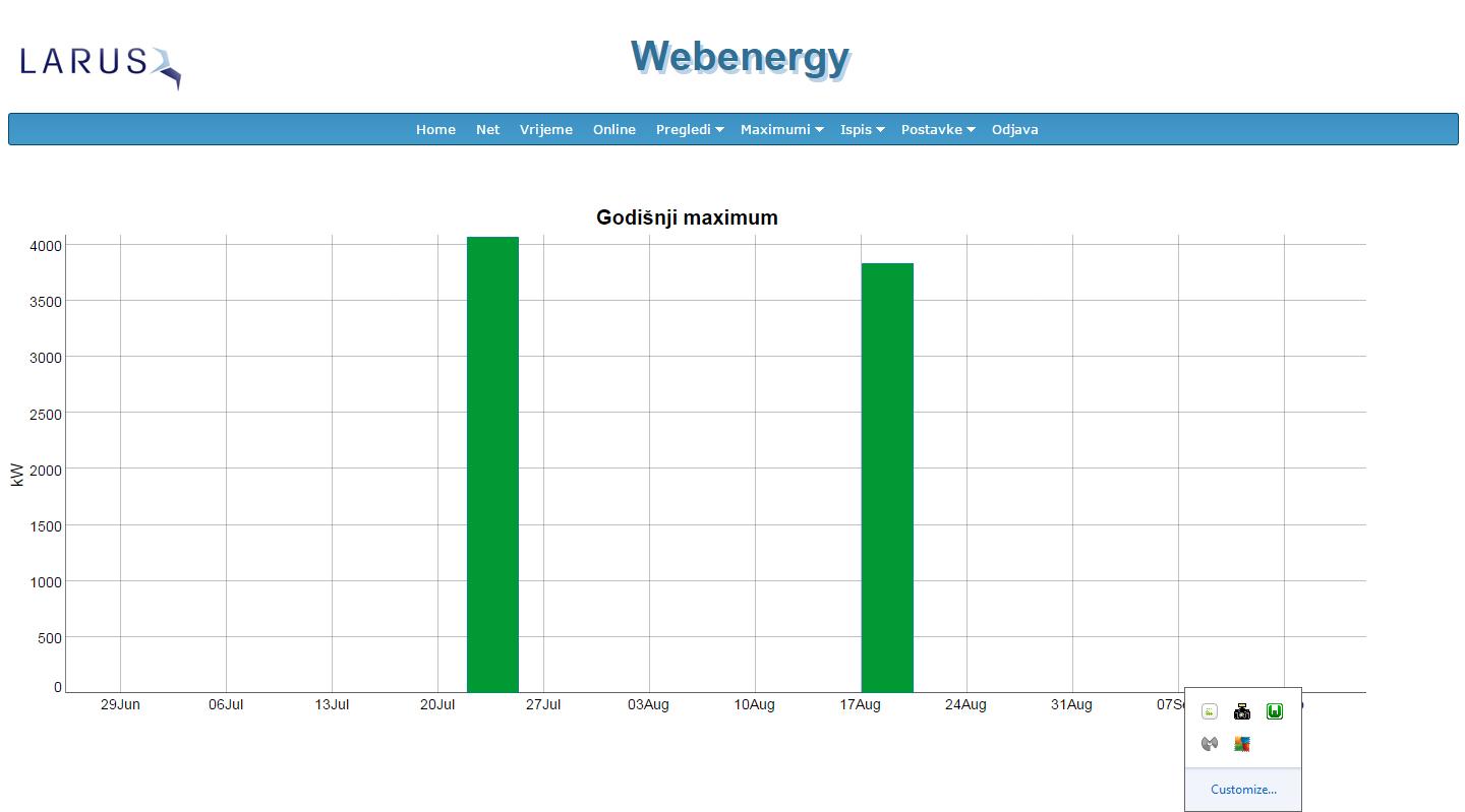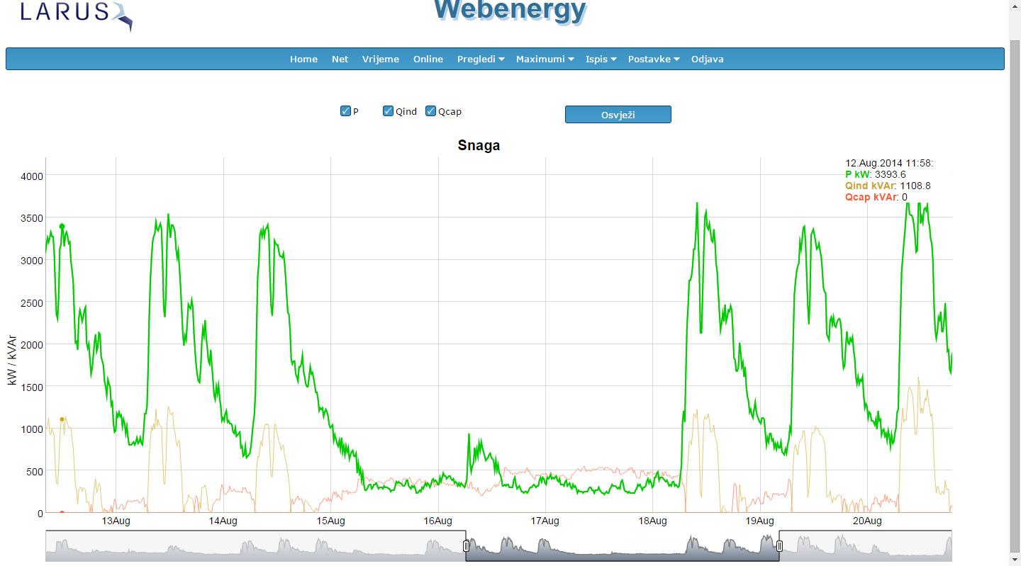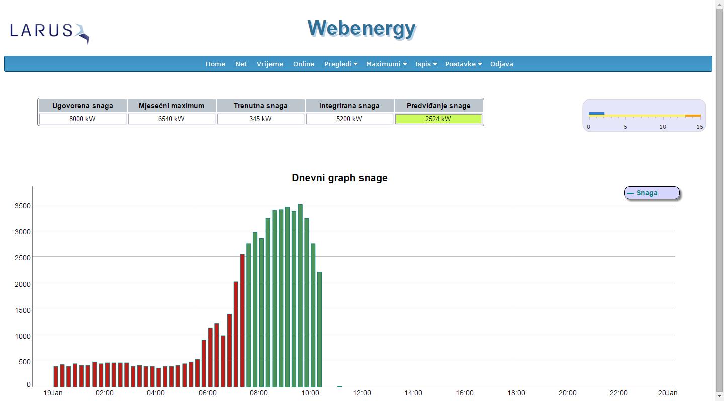 Prikaz izmjerene snage od početka dana, trenutna snaga, integrirana snaga, ugovoreni maximum, postignuti mjesečni maximum i 15 minutni period.
