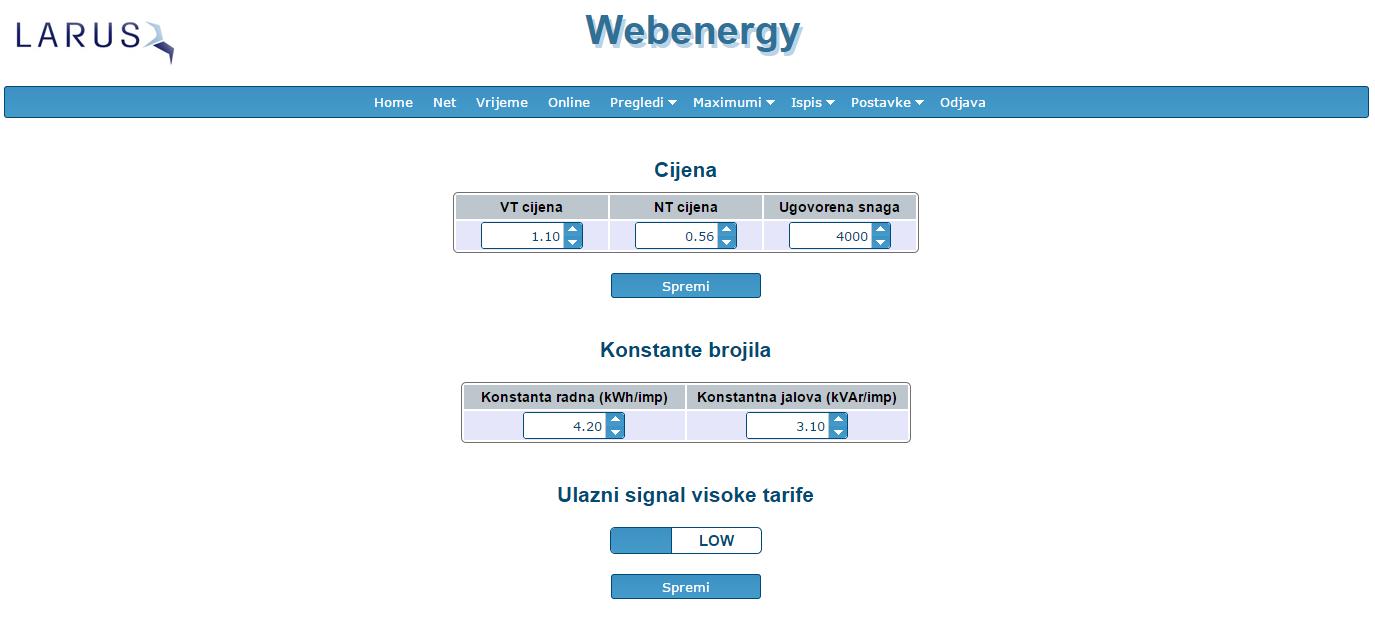 Podešavanje parametara sustava, konstanta brojila radne i jalove energije, cijena energije u višoj i nižoj tarifi i ugovorena snaga.