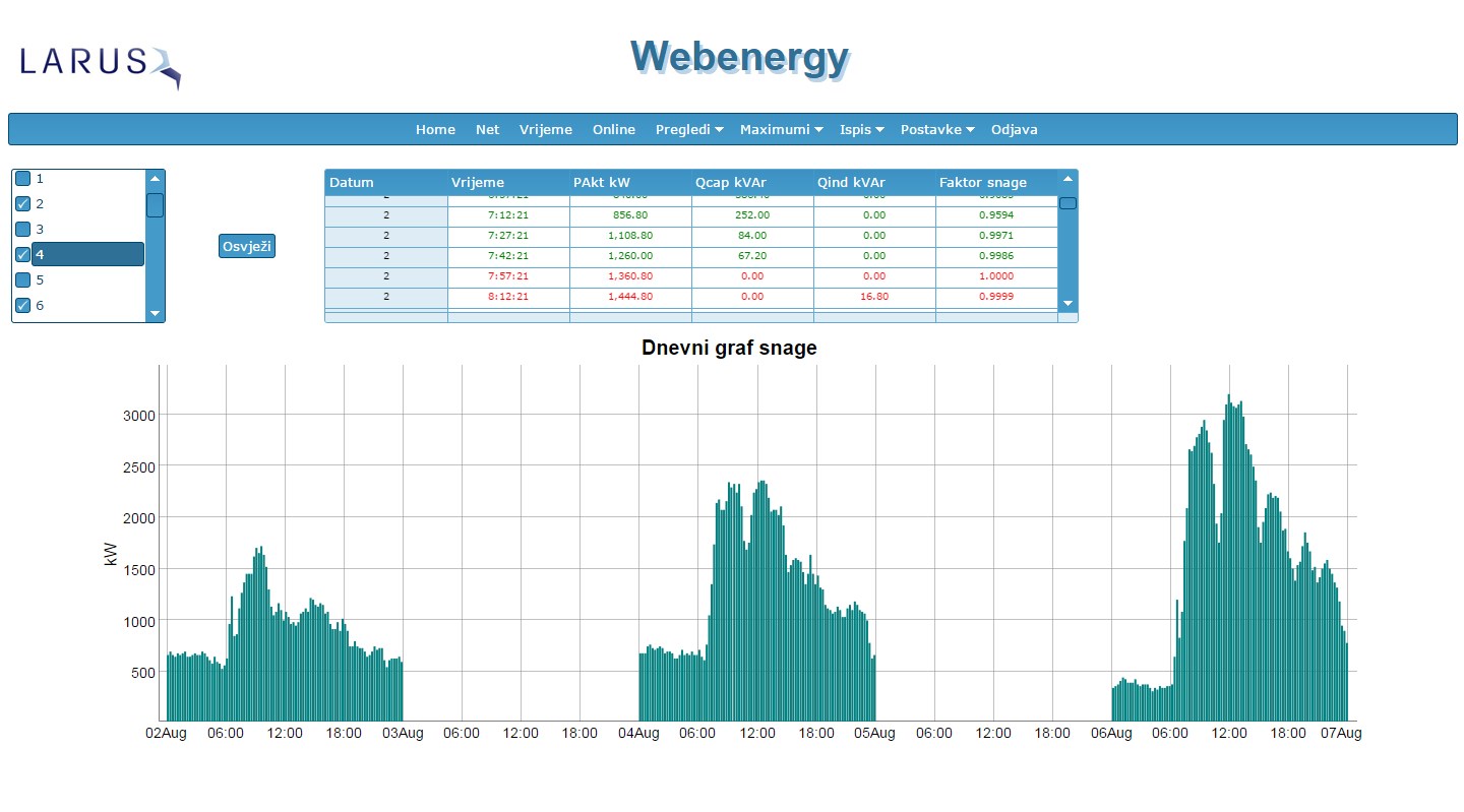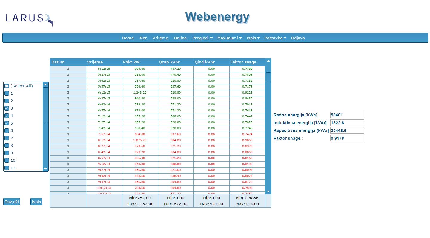 Tabelarni prikaz izmjerenih vrijednosti. Mogućnost prikaza za pojedine selektirane dane. Prikaz minimalnih i maximalnih izmjerenih vrijednosti.Izračun energija i faktora snage za dani period.