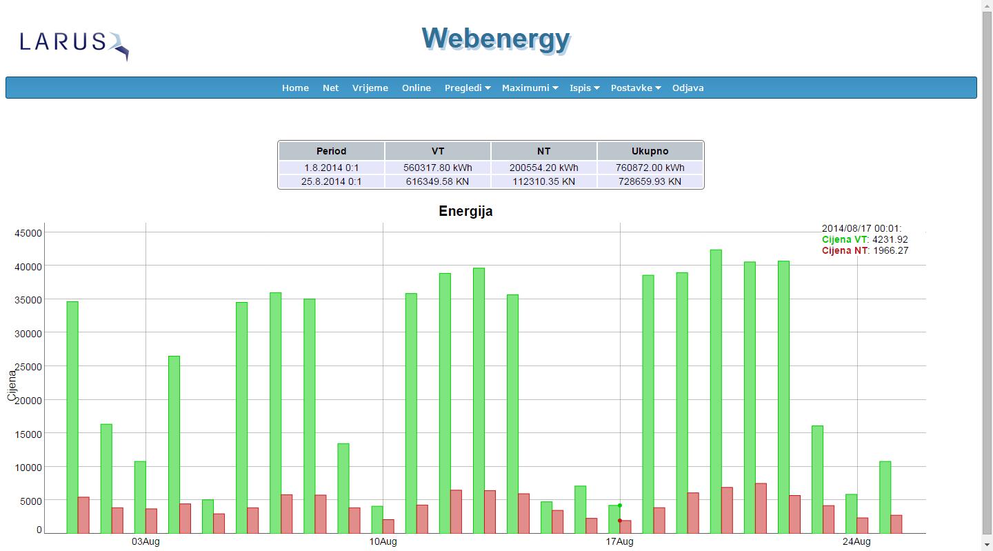 Grafički prikaz potrošnje energije po danima. Prikazana je cijena za svaki dan u višoj i nižoj tarifi kao i ukupna potrošnja i cijena u danom periodu po tarifama.